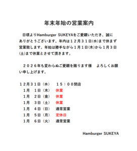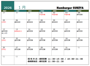 🍔1月の営業案内です。2026年もよろしくお願いいたします。
