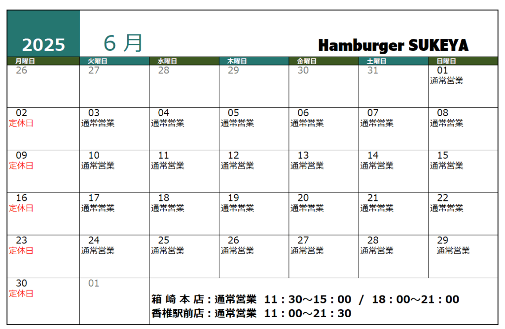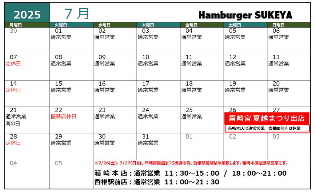 🍔7月の営業案内です。7/26(土)、2/27(日)は筥崎宮の夏越まつりに出店予定となっております。箱崎本店は通常営業、香椎駅前店は休業させて頂きます。