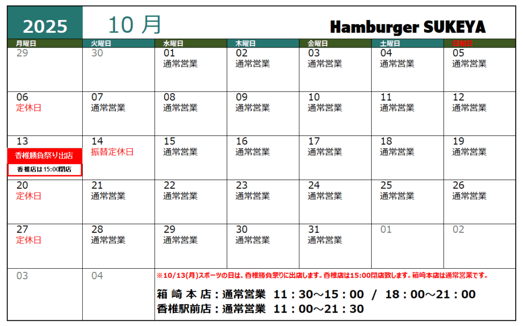 🍔10月の営業案内です。10/13(月)スポーツの日は香椎勝負まつりに出店予定となっております。箱崎本店は通常営業、香椎駅前店は15:00閉店とさせて頂きます。